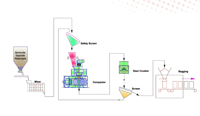 Proces granulacije gline ima za cilj proizvodnju granula. Da bi to bilo moguće, prisilni dodavač preše gura sirovinu između dva valjka koji se okreću u suprotnim smjerovima. Pod zbijanjem preše, mješavina se pretvara u brikete ili pahuljice koje se zatim zgnječe i pregledaju. Konačni proizvodi je granula (1-4 mm, 1-5mm...). Kapacitet ovisi o prirodi sirovine, odabranom rasponu veličina gotovih granula i Cjelokupnoj tehničko tehnološkoj proizvodnoj liniji. Osim toga, na kvalitetu konačnog proizvoda utječe i drobljenje I izbor opreme za provjeru. Sferičnost granula može se poboljšati